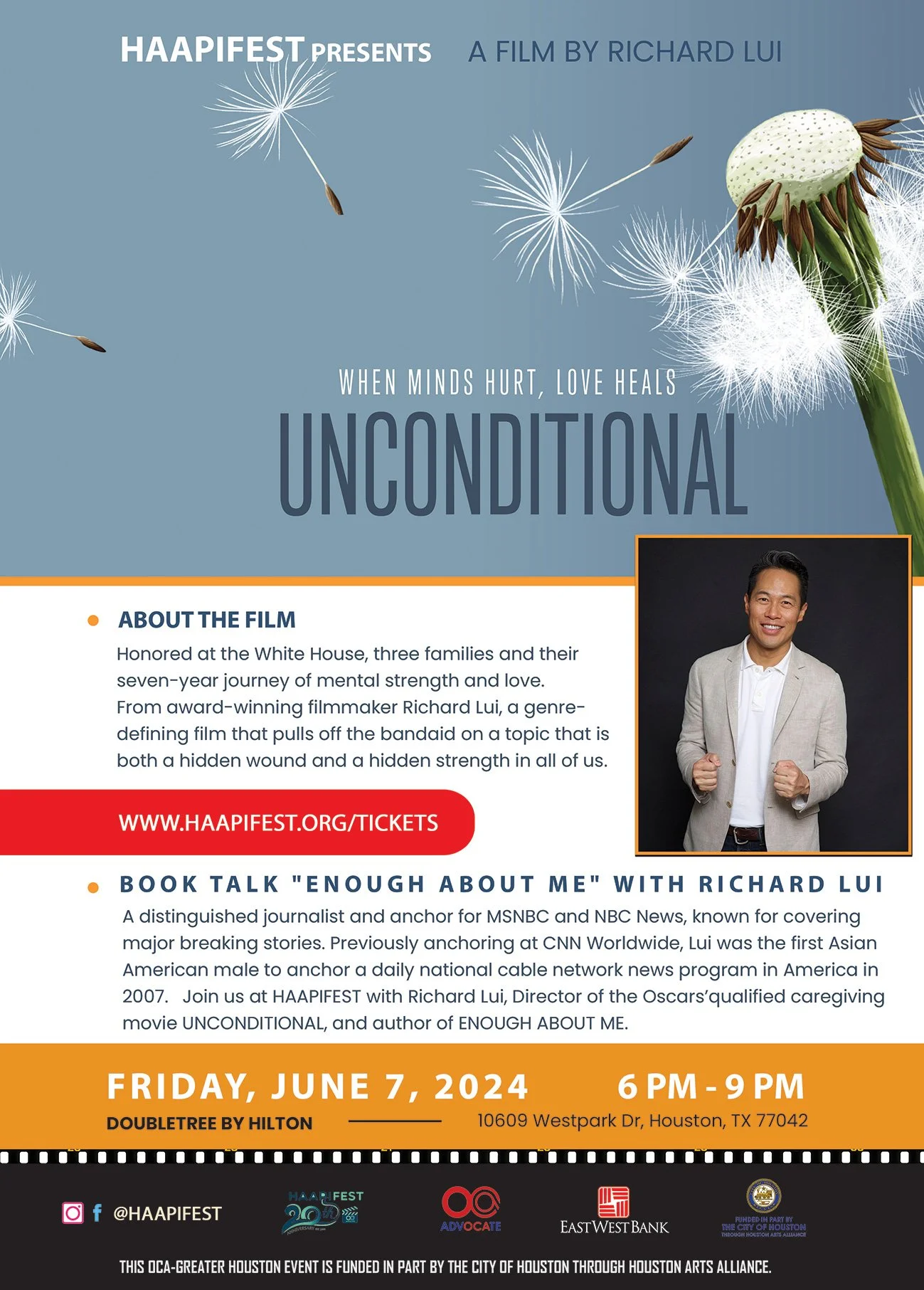 Houston, TX - HAAPIFEST is proud to announce the special screening of UNCONDITIONAL, a poignant and powerful film directed and produced by award-winning filmmaker Richard Lui. The event will take place on June 7 from 6 PM to 9 PM at the DoubleTree by Hilton, located at 10609 Westpark Dr, Houston, TX 77042.