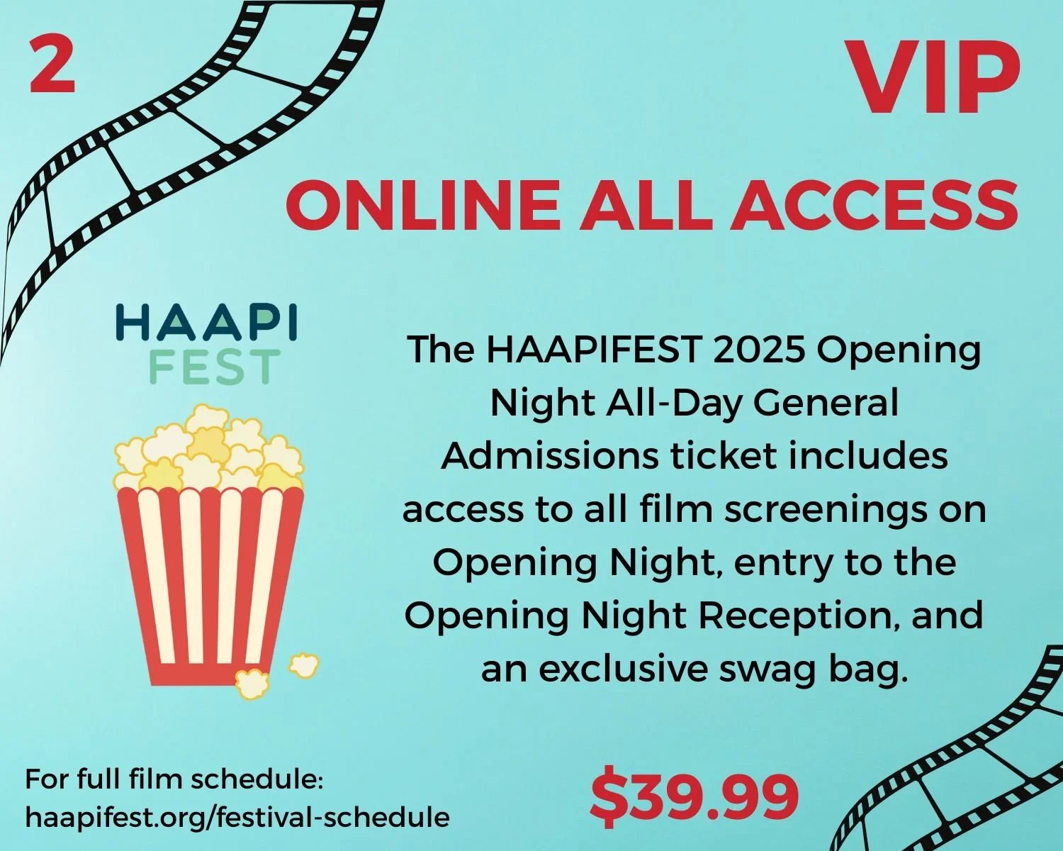 The HAAPIFEST 2025 Opening Night All-Day General Admissions ticket includes access to all film screenings on Opening Night, entry to the Opening Night Reception, and an exclusive swag bag.